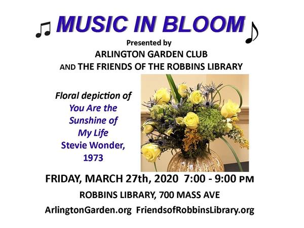 Tickets are now on sale! They are $30 in advance, $35 at the door and may be purchased at the Circulation Desk of the Robbins and Fox Libraries, the Book Rack, on Eventbrite, or from Patsy Kraemer (patsy@patsykraemer.com, 781-858-8629). Make checks payable to the Arlington Garden Club. This event is a fundraiser for the Arlington Garden Club and the Friends of the Robbins Library.